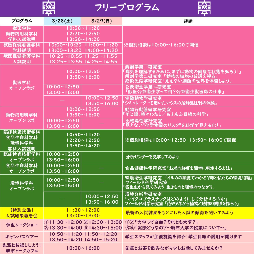 学科入試説明/オープンラボ/教職課程ミニ説明会(28日のみ)/相談ブース/馬の放牧/図書館見学/いのちの博物館見学/不動産相談会/パネル展示/麻布出る杭ポスター展示 等
